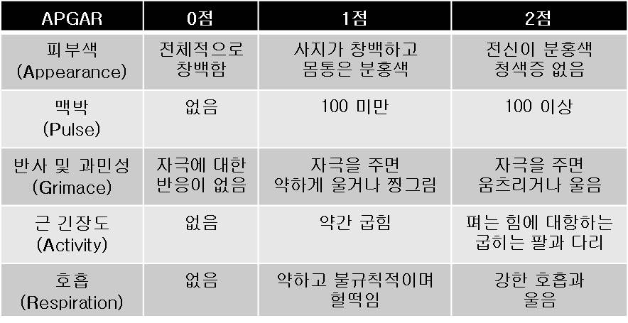A(appearance, color)는 외모와 피부색깔, 붉은색의 피부2점, 사지가 창백하고 얼굴이 붉으면 1점, 청색증 0점
