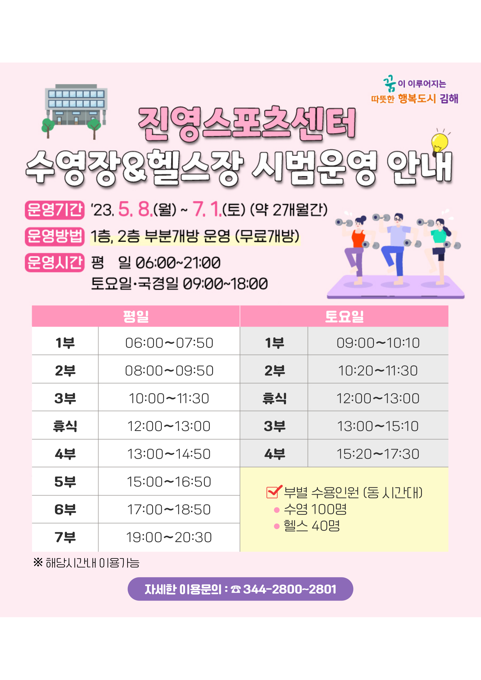 진영스포츠센터 개장으로 23.5.8 ~ 7.1까지 시범운영으로 무료로 운영되고 있습니다.